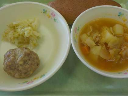 今日の献立:胚芽パン、レバーケーゼ、ザワークラウト、アイントプフ