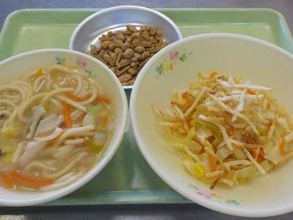 本日の献立:味噌煮込みうどん、ポテチサラダ、豆ナッツ黒糖
