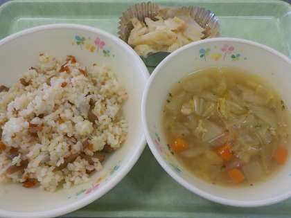 本日の献立:鳥ごぼうピラフ、ツナポテトのマヨネーズ焼き、ABCスープ