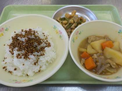 本日の献立:ごはん、ふりかけ、肉じゃが、鶏肉の大豆炒め