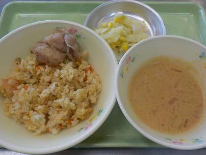 今日の献立:ジャンバラヤ、フライドチキン、コールスロー、クリーミートマトスープ