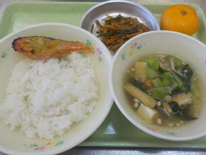 本日の献立:ごはん、鮭のごまみそ焼き、小松菜汁、茎わかめのきんぴら、くだもの