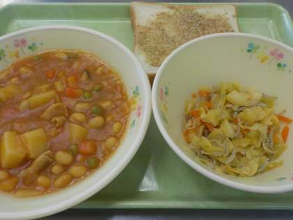 本日の献立:セサミトースト、チキンビーンズ、じゃこサラダ