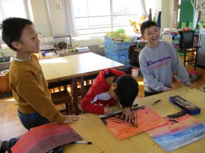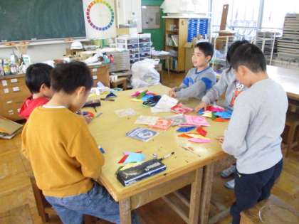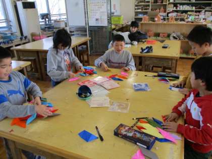 作業の続きが終わると、おり紙をして組み合わせていきます。枚数を数えていました。