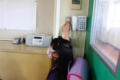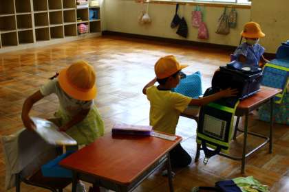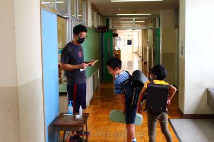 教室前で健康観察、学習用具を出して、係の仕事もして・・