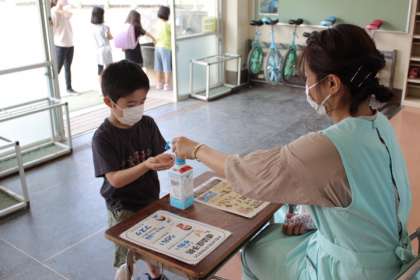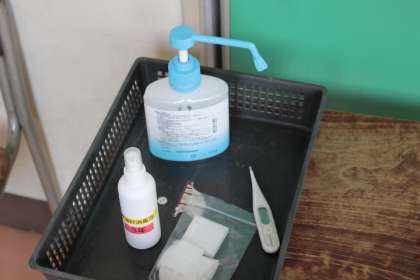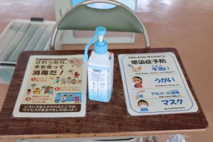 児童玄関前で、「うがい・手洗い」をしてアルコール消毒をします。教室前で体温チェック等の健康観察もしだいに習慣化してきました。