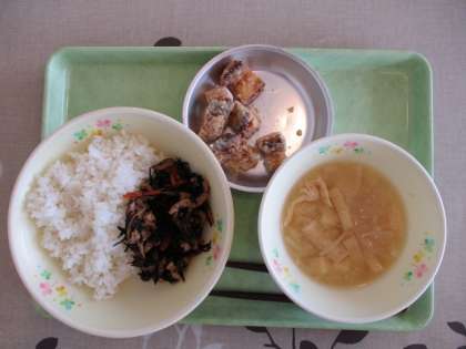 本日の献立:ごはん、サバの竜田揚げ、ひじきの炒め煮、みそ汁