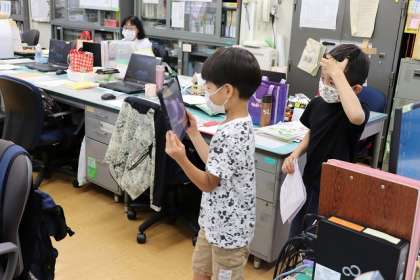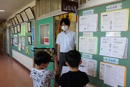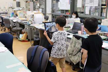 1年生の紹介する動画づくりが始まりました。職員室の撮影です。