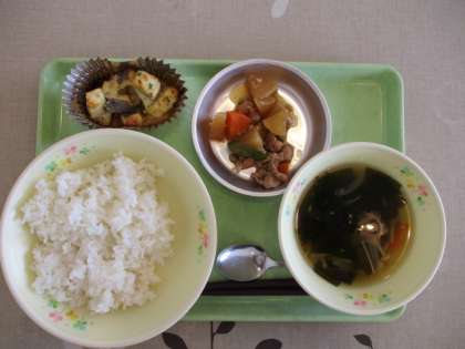 今日の献立:ごはん、白身魚のみそマヨネーズ焼き、大根の煮物、わかめスープ