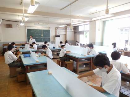分校舎金工室で、木材加工について、木材の性質を学んだあと、作業するための紙やすりの準備をしています。