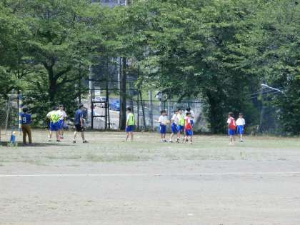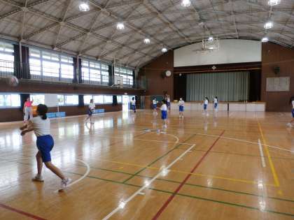 男子は校庭でハンドボールの攻防、女子は体育館でバレーボールのアンダーハンドパスの練習をしています。