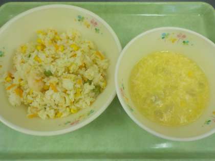 今日の献立:エビピラフ、コーンとたまごのスープ