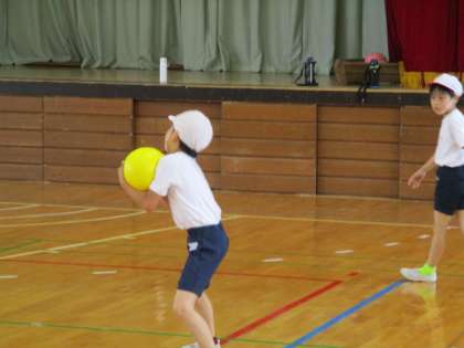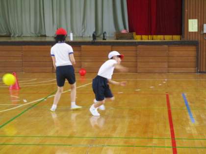 体育館でボールあてゲーム(何回あてられたかな?ボールをキャッチできたかな?)