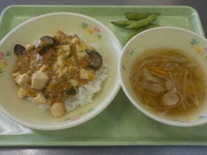 本日の献立:ごはん、マーボナス、もやしの中華スープ、枝豆
