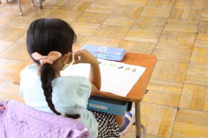 絵を見てひらがなで名前を書いています。