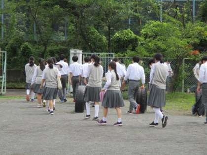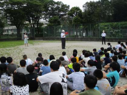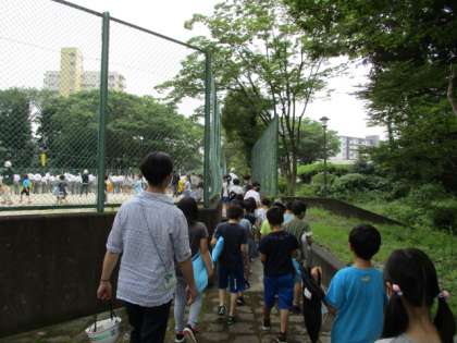 第2避難所(白グラ)に移動します。校長先生より「『情報を知る、河川に近づかない』等の具体的な行動のあり方を教えていただきました。