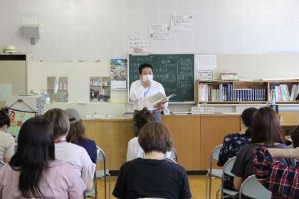 本校舎4階の図書室で午後2時より開催しています。校長より、修学旅行について説明をしています。