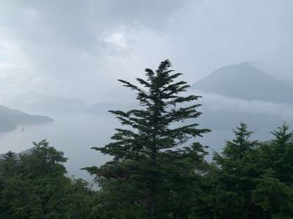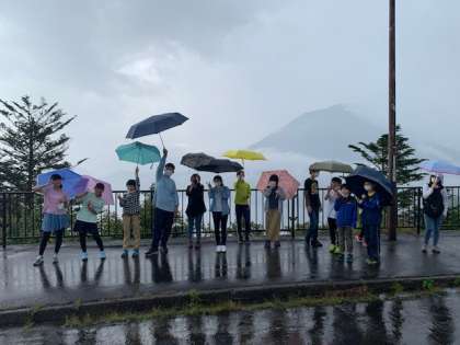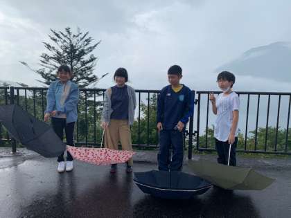 中禅寺湖展望台に来ました。あいにくの雨ですが。みんな元気いっぱいです?
