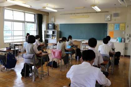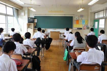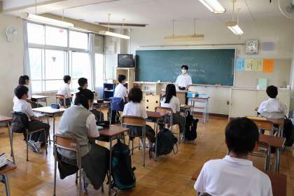 「今日は、令和2年度1学期の終業式です。・・(中略)中学部でいうと、伝統芸能鑑賞教室、職場体験学習、地域防災宿泊訓練などの地域行事も中止となりました。休校だからといって、決して楽しいわけではない、お休みの日を過ごさなければなりませんでした。三蜜(密集、密着、密接)を避け、三取る(マスク、距離、水分)を実行する、学校生活と同じ生活様式を変えずに、夏休みには、お家でも気を付けて行動してください。館小中学校の皆さんとそのご家族が、健康で安全に過ごされることを願っています。」校長先生のお話に聴き入る生徒の様子です。