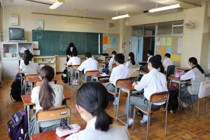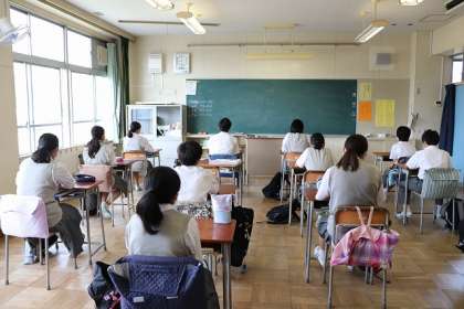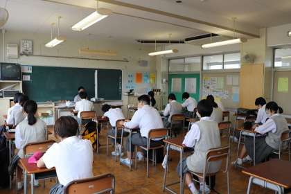 「明日からは、いつもの年よりは短い夏休みが始まります。夏休みの学校プールもないので、夏の日差しの実感もないかもしれませんが、待ちに待った、本格的な夏の季節が始まります。健康に気を付けて、夏の太陽の恵みを体いっぱいに受けて、交通事故や海や山の事故にも十分に注意して毎日を過ごしてください。また、2学期の始業式に元気に会いましょう。」との呼びかけに聴き入る生徒たちです。
