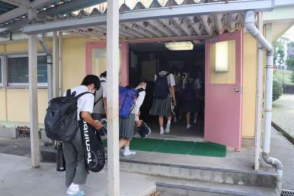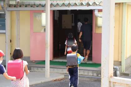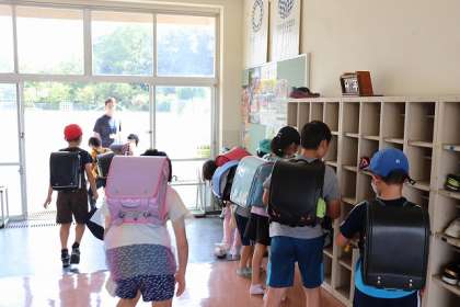 大型台風の接近を想定した集団下校訓練の開始です。