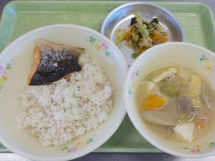 本日の献立:ごまごはん、焼き魚、豚汁、野菜のおひたし