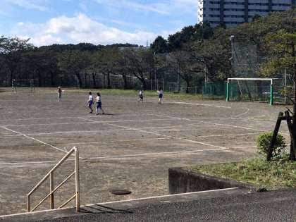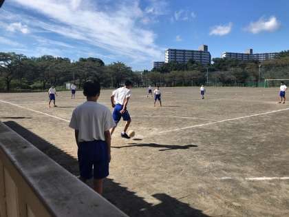 男女とも校庭でそれぞれキックベースの攻防、ハンドボールのシュートの練習をしています。