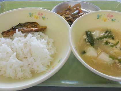 本日の献立:ご飯、サバの香り焼き、五目きんぴら、ニラ玉味噌汁