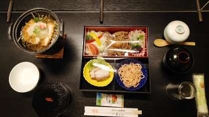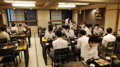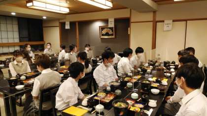 建仁寺で座禅を組む体験をした後、宿に着きました。舞子さんの出迎えがありました。班ごとに一緒に写真をとりました。夕食もディスタンス、衝立など感染症対策をとっています。