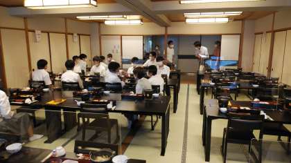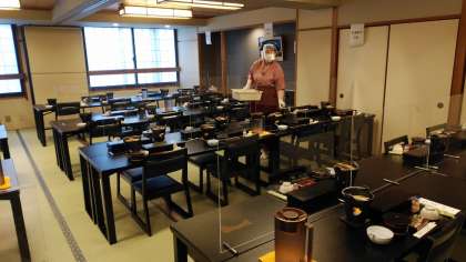 朝食の時間です。おなかにやさしい京都鍋焼きうどんもいただきました。