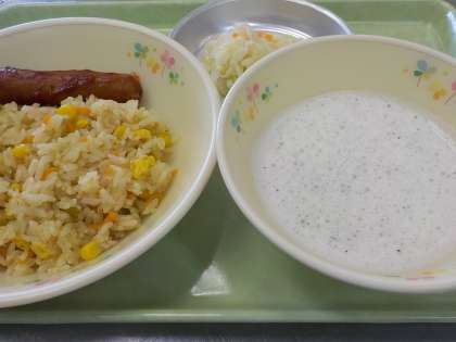 本日の献立:メキシカンライス、ボイルウインナー、白いんげん豆のポタージュ、コールスロー、リンゴジュース
