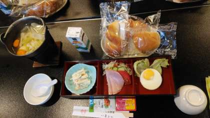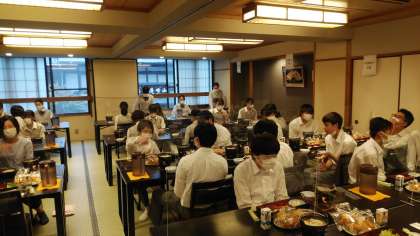 部屋を片づけて健康チェックのあと、三日目の朝食です。みんな元気です