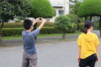 「雲と天気の変化」校庭に出て「雲の動き」を観察しています。