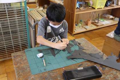 「夕やけにはえる町」(黒い画用紙に描いた街なみをデザインカッターで切り取っています)