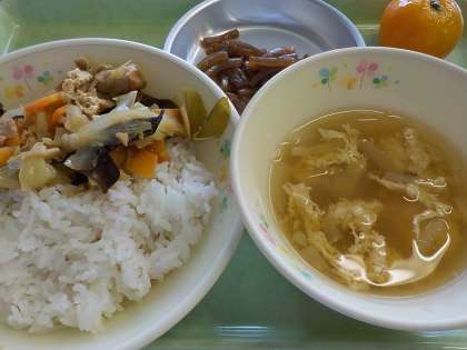 本日の献立:ごはん、生揚げのみそ炒め、八王子産冬瓜のスープ、ピリ辛こんにゃく、くだもの