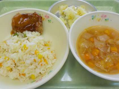 本日の献立:コーンピラフ、チキンソテーのパッションフルーツソース、ミネストローネ、こふきいも