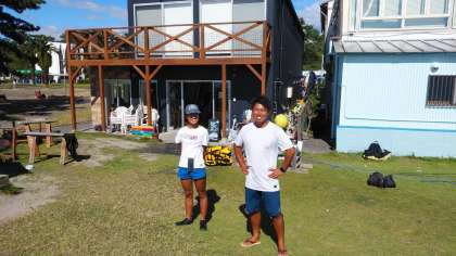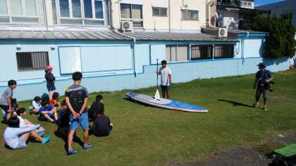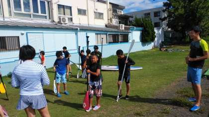 本格的なサーフボードとパドルでまずは陸上で練習です。先生方も日焼けしています。