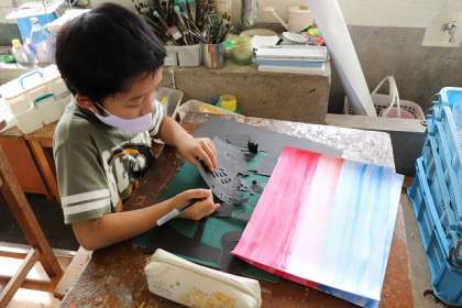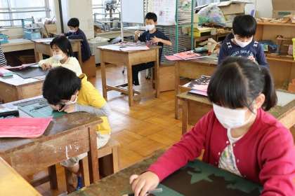 「夕やけにはえる町」(黒い画用紙をデザインカッターで切り取り、街並みの影を作っています)