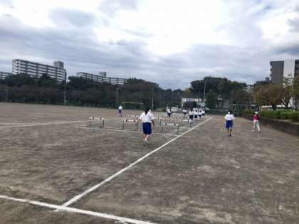 ハードルの飛び方をマスターするために、歩幅やタイミング、足の上げ方などを確認しながら、だんだんスピードを付けて跳ぶ練習をしています。
