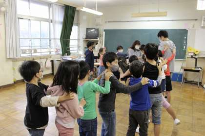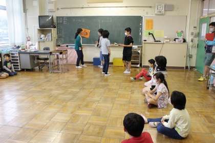 雨天のため、各教室でゲームを楽しみました。1・2班の様子です。
