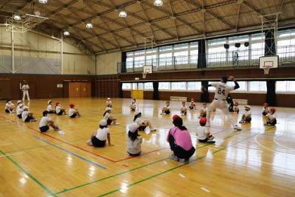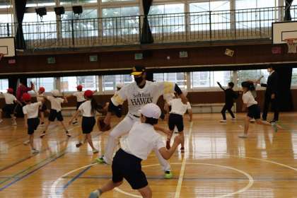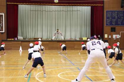 元プロ野球選手の指導のもと、キャッチボールを楽しみました。準備運動から元気パワーをもらいます。投げ方の練習です。