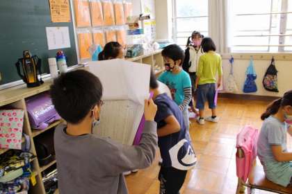 書いた作文を友だちに紹介しています。
