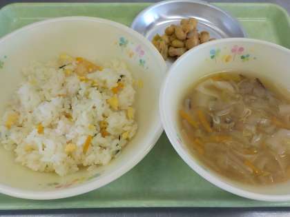 本日の献立:エビチャーハン、大豆と鶏肉の中華炒め、ワンタンスープ
