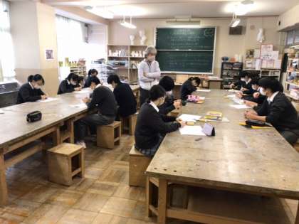 写真は中学部の1時間目の授業で、1年の技術(木工で引き出しを作っています)、2年理科(鳥類・哺乳類の体の特徴や生活の学習)、3年美術(篆刻の作業)の様子です。