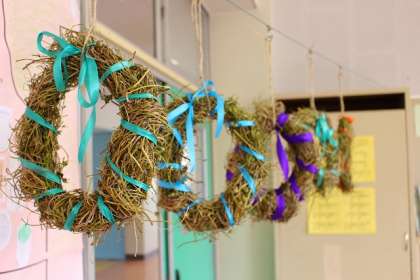 漢字の学習「出」。あさがおのツルで作ったリースが飾ってあります。