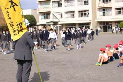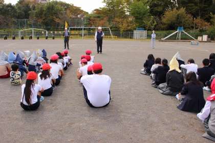 校庭で体育の6年生(静かに避難しています)中学部も本校舎での授業中に実施しました。校長先生から「『東京防災』(地震そのときの10のポイント」を通して、どういう行動をとったらいいのかを教えていただきました。