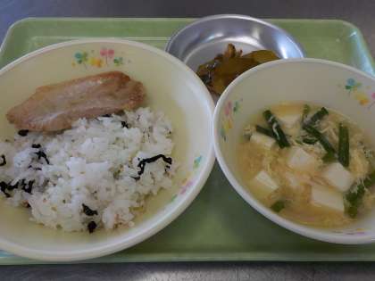 本日の献立:磯ごはん、豚肉の生姜焼き、にら玉味噌汁、ピリ辛キュウリ