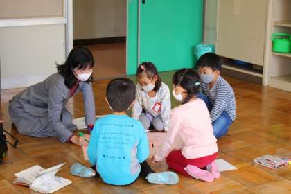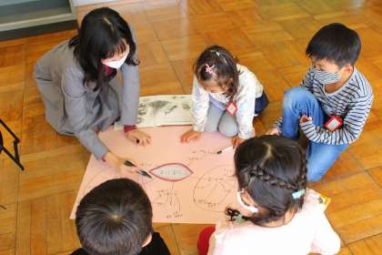 クラスのイメージマップをつくりながら、どれならできそうか話し合っています。校長先生にもおたずねしています。