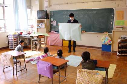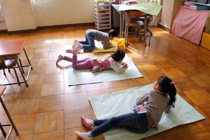 『ぎょぎょぎょ!おさかなジャンボクッション』これから模造紙をぐしゃぐしゃにしていきます。寝転がることで、紙の柔らかさを楽しみます。