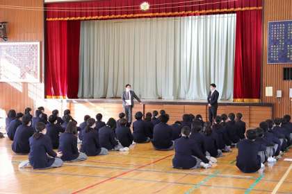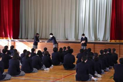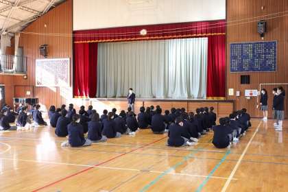 生徒会の取組(アイデア箱・挨拶)、各委員会より(ありがとうの木の取組・表彰など)の様子です。学校サポーターの先生紹介もありました。